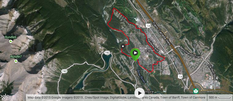 The run starts and finishes at the road bridge over the Bow River, near the centre of town. If you pass over the bridge from downtown there’s a parking area on the left near the boat launch. From the parking, head upstream and across the road bridge and turn right down the path that runs along the left bank of the Bow River. The views from the bridge and the river bank are awesome: