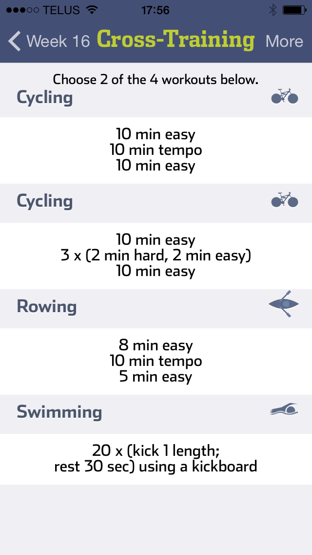 And it was great. Plug your time for running 5km, add the race date and distance and voila a 16 week training plan based on three runs per week (intervals, tempo and long runs at prescribed paces based on your 5km pace), with cross training (cycling, swimming or rowing) in-between: