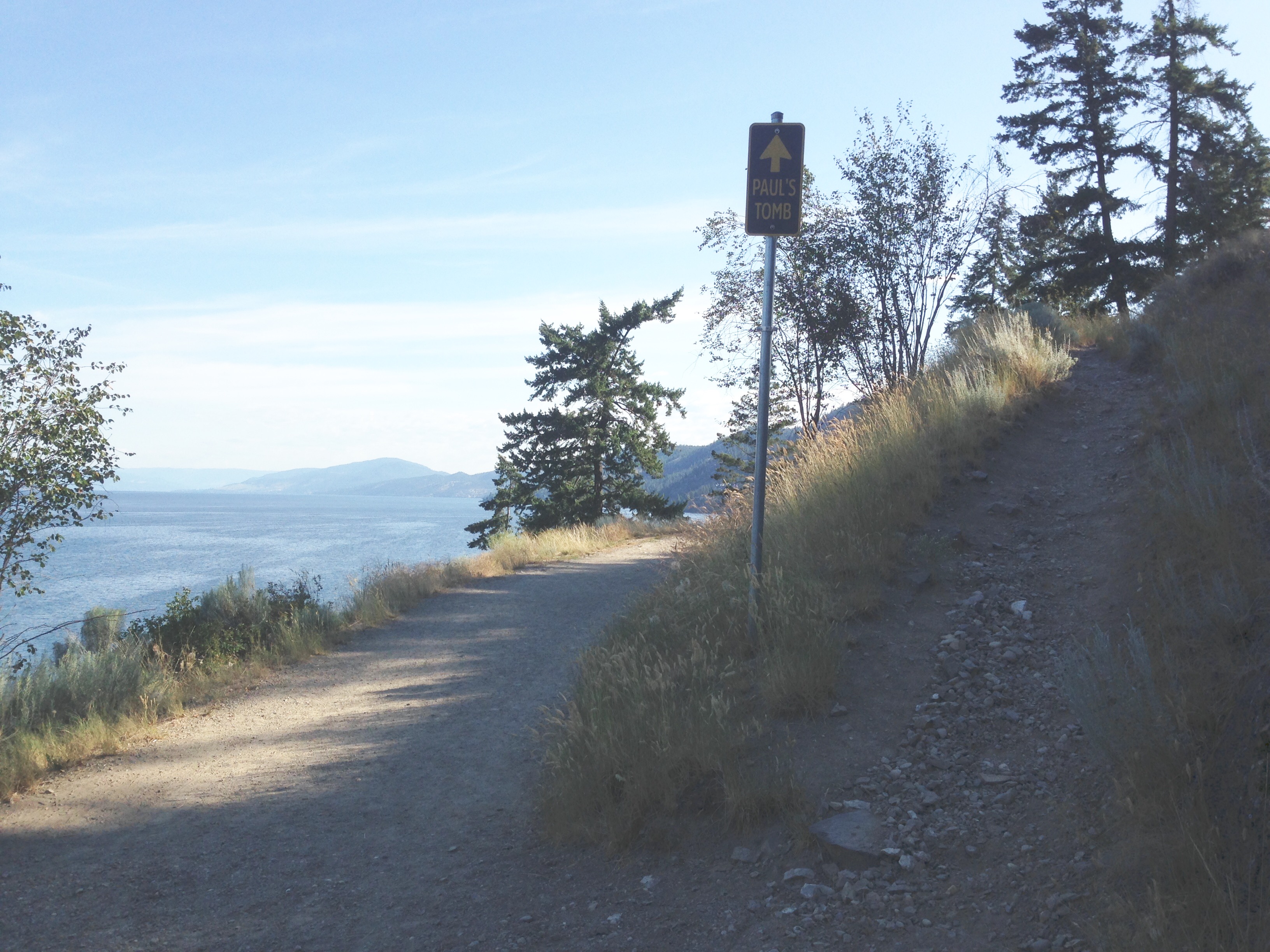 Begin by taking the trail from the car parking area through the frisby golf course and then joining the road (Poplar Point Drive) on the left that runs north along the edge of the lake (i.e., away from downtown). Continue along the road for around 1.5km and up a steep hill. Turn left at the top and you’ll see a wide trail with a gate ahead of you heading uphill on the right. Take the trail and turn left at the top and then continue up a slight incline at first and then down towards Paul’s Tomb which is at the 3km point, taking in the view as you go: