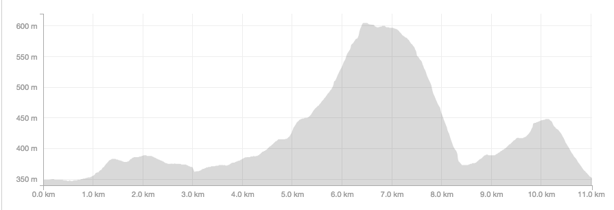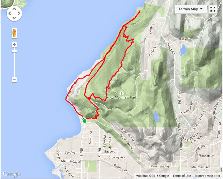 Knox Mountain Park is located in the north of Kelowna. It offers fantastic views over the city and beyond but that’s only part of the reason to run here. The other is that it’s only around a 10-15 minute run from downtown to the trail head and once there you have the choice of wide, stoney trails to fast, technical, steep and dusty rock and root strewn single track. My preferred run is a looping affair that covers 11km with 374m of climbing, some of it gentle, some it less so. It all looks likes this on Strava: