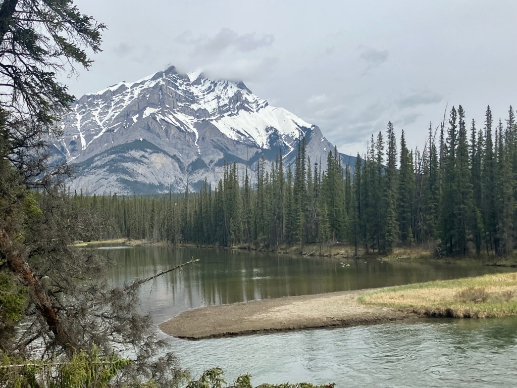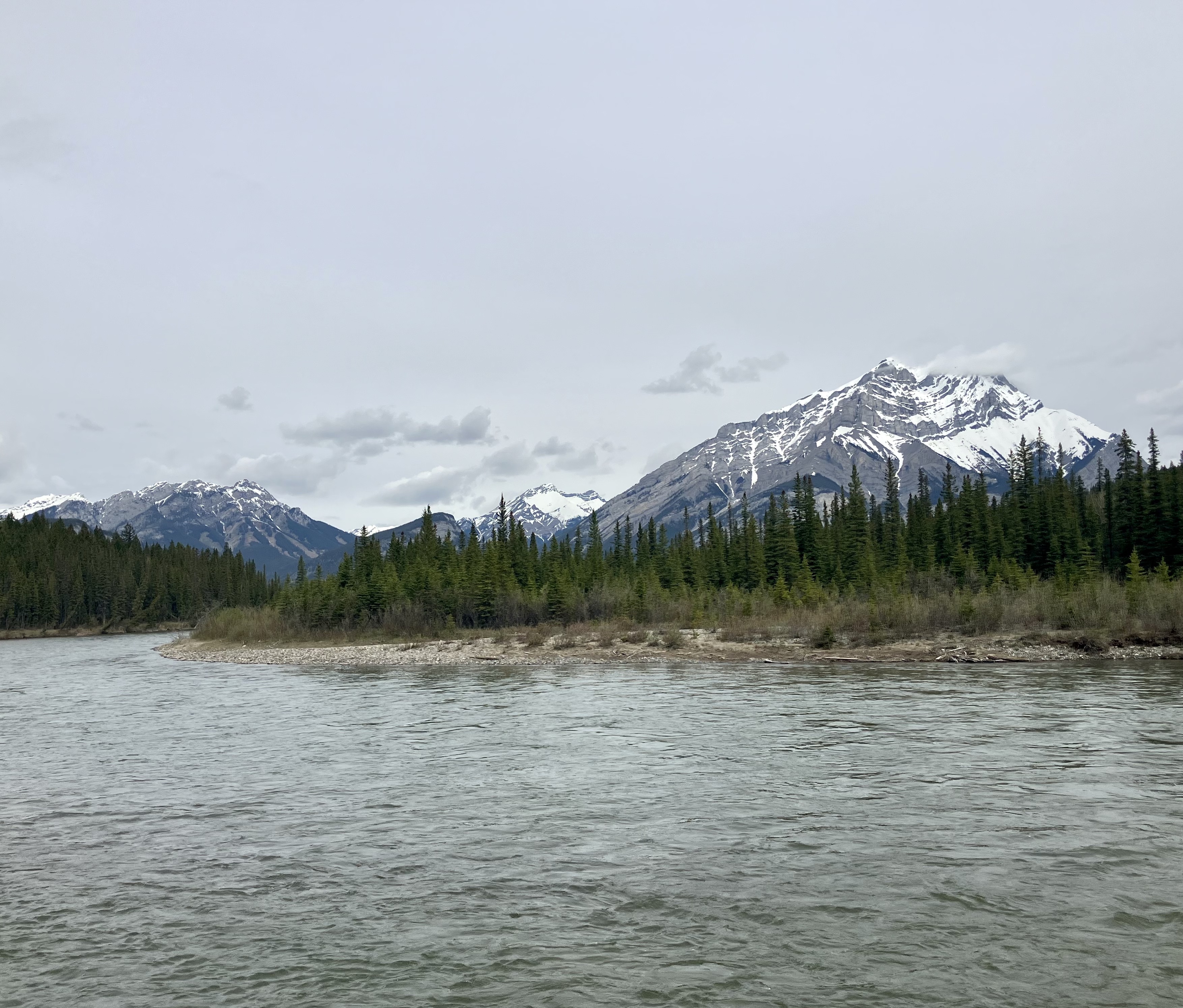 Follow the trail along the bank of the Bow River to the pedestrian bridge which we crossed and then headed along the opposite bank to the until the Banff Avenue Bridge and you are done.