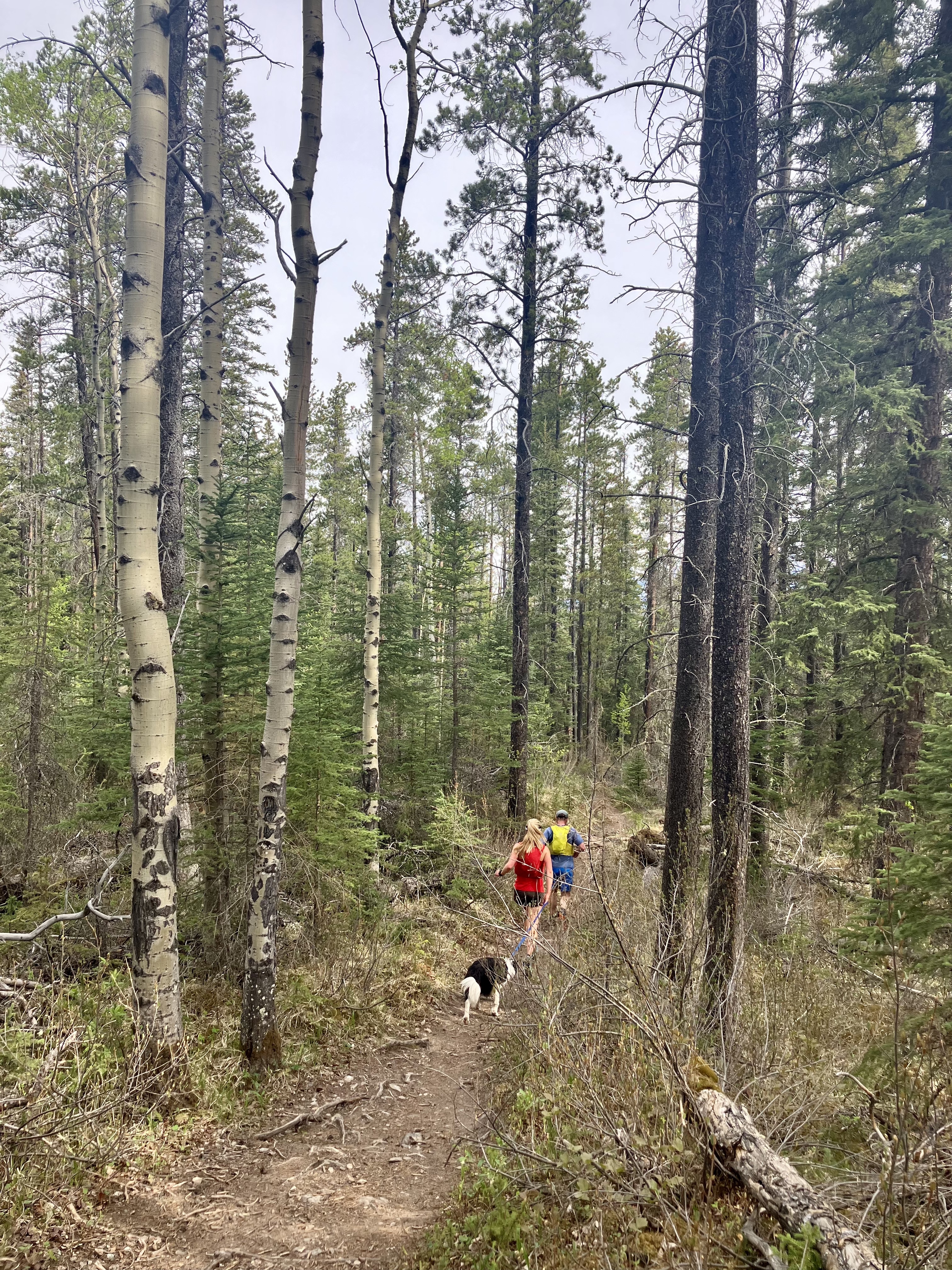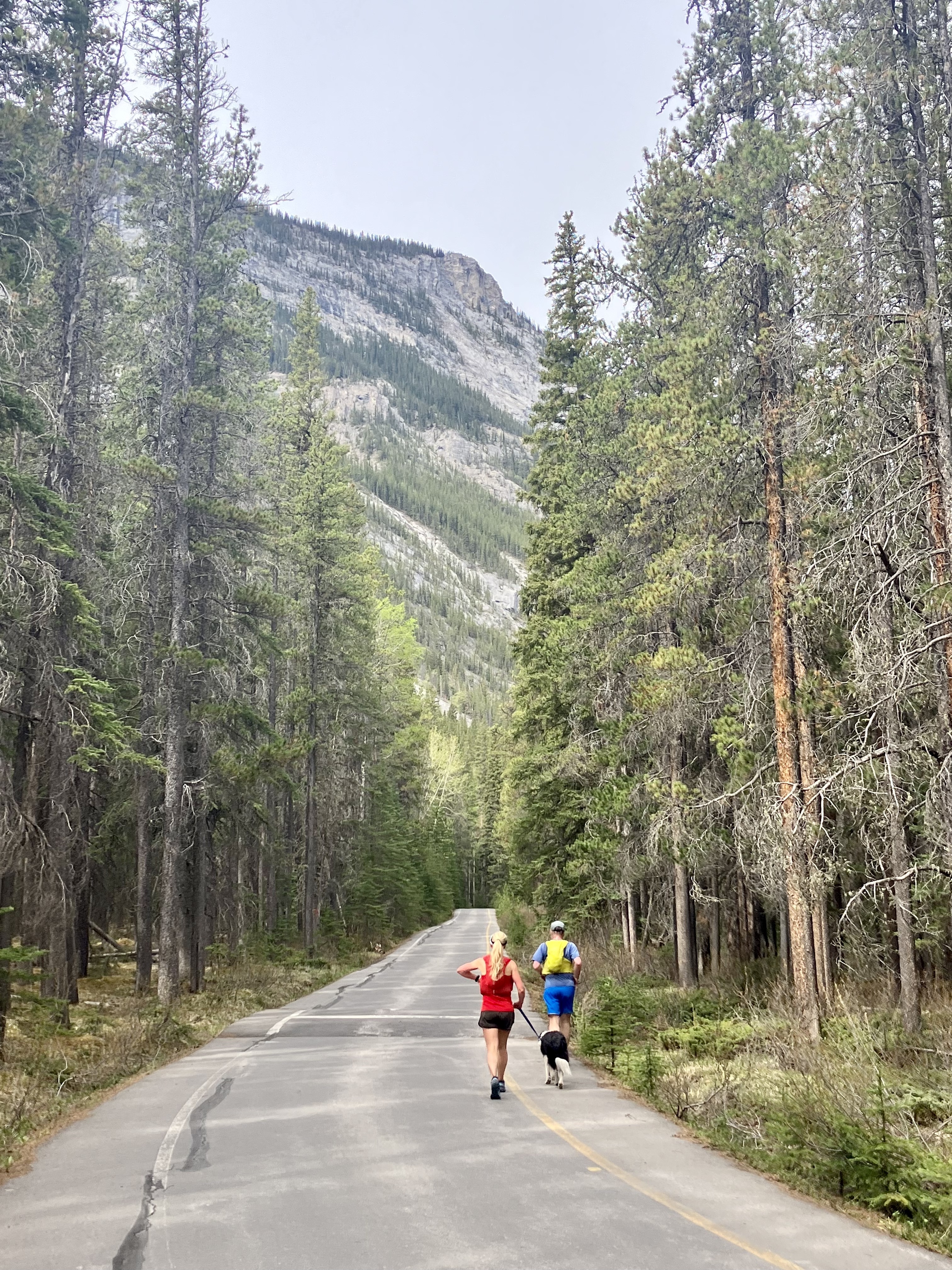 All that to say, I was very pleased when my good friend and ace local photographer Simon Lee suggested a Saturday morning jaunt from Canmore to Banff along the Rundle Riverside Trail, as part of his quest to get fit for this year’s TransRockies. I wasn’t going to pass that up. And we were joined by the always modest, unassuming and yet powerful Bob Graham Round alumni Jennifer Shutt and Tom the border collie – on the condition that they agreed to run slowly.